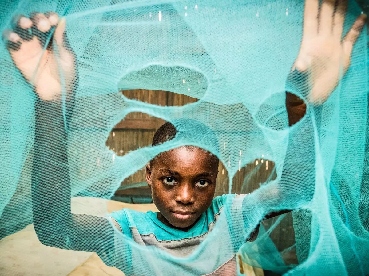 一個(gè)男孩指著自家一張舊蚊帳上的洞。在莫桑比克,盡管老一代蚊帳有助于保護(hù)家庭免受瘧疾侵襲,但它們也有缺點(diǎn)。這些蚊帳需要每六個(gè)月在殺蟲劑里浸泡一次,變臟后也不能重復(fù)清洗,不然就會(huì)留下蚊子可以穿越的洞。