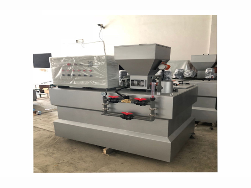 干粉絮凝劑從螺旋推進(jìn)器內(nèi)進(jìn)入速溶器內(nèi)與清水進(jìn)行預(yù)混,被濕潤(rùn)的物料進(jìn)入配制槽進(jìn)行攪拌稀釋,按要求濃度進(jìn)行配制;配制過(guò)程中,進(jìn)水量在流量計(jì)觀測(cè)下必須相對(duì)穩(wěn)定,從而保證在整個(gè)工作過(guò)程中,配制溶液濃度不變。
